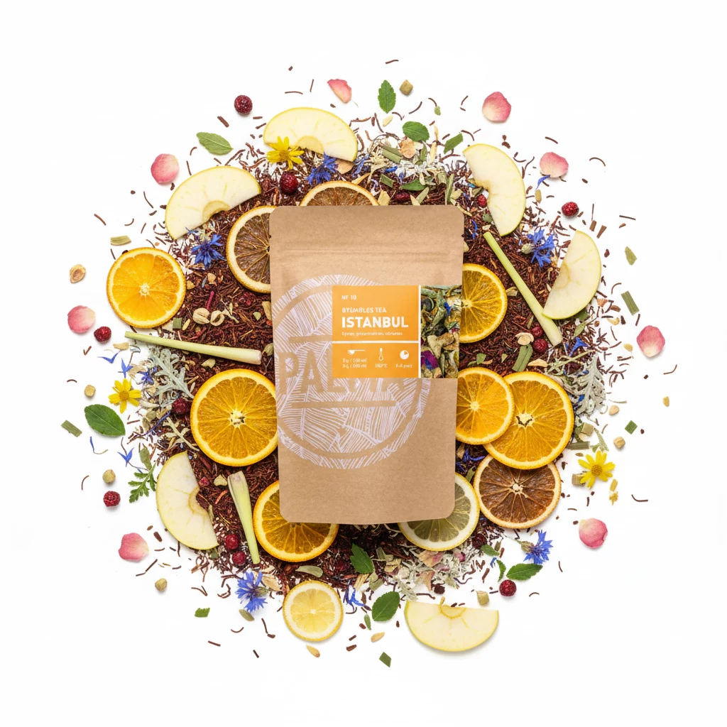 Almadarabok, rooibos, citrusszeletek, citromfű, fehér tea (Tai Mu Long Zhu 4%), citrom verbéna, citrushéjak, almaszeletek, aroma, napraforgószirom, citrommirusz, búzavirág szirom, rózsaszirom