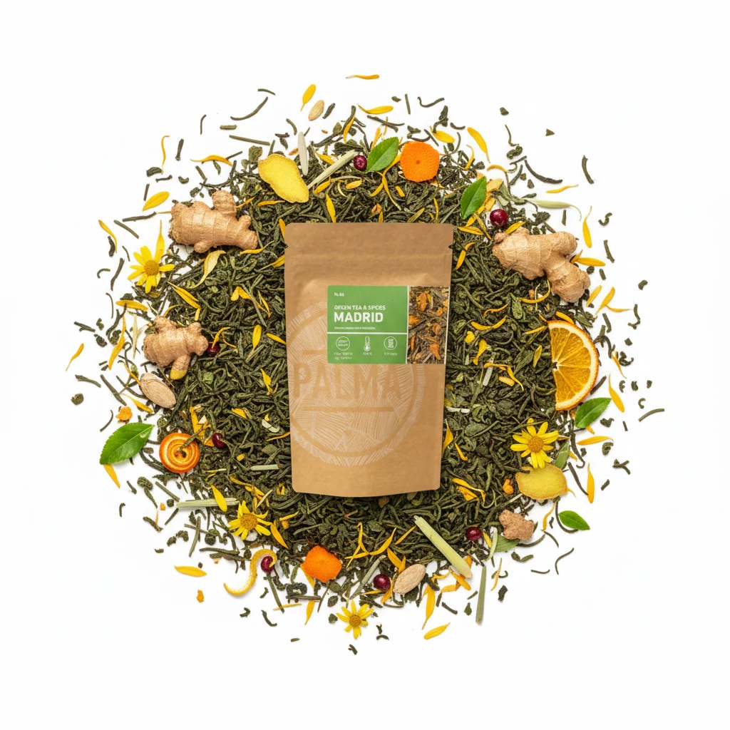 Összetevők: zöld tea (76 %), gyömbér (6 %), narancsdarabok (4 %), citromhéj, aroma, narancsszirmok, citrom mirtus, citromfű, napraforgó szirmok